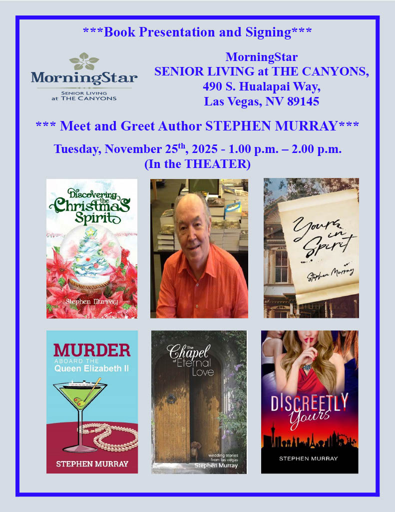 Fogo De Chao 360 East Flamingo Road, Las Vegas, NV, United StatesI thank the collective management of Fogo de Chão for having me back for yet another book signing in their lounge. I will be signing and selling copies of my cozy murder mystery, Murder Aboard the Queen Elizabeth II, the award-winning, The Chapel of Eternal Love, the sequel, Return to the Chapel of Eternal Love, my 5-Star Reader’s Favorite crime fiction, Discreetly Yours, along with the light-hearted, paranormal novel, Yours in Spirit. If you have never eaten at a Fogo De Chão, you are missing a treat. The Sunday brunches are particularly sumptuous with an extensive display of salad items, and the assortment of meats carved at your table from skewers, just keep coming and coming and coming! Totally delicious. If you are not a ‘Sunday brunch’ person, there is a delightful bar where visitors can enjoy friendly cheer with mimosas,... Read more »