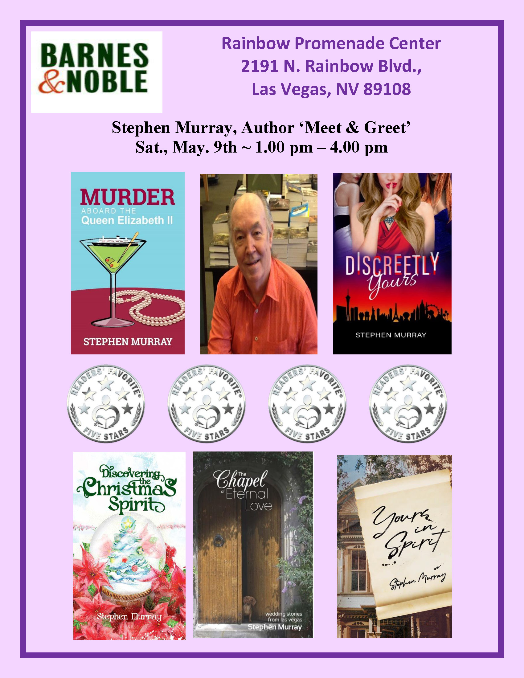 I am so grateful for Life Enrichment Director, Marlena Thomas, for asking me to speak to the senior residents at MorningStar Senior Living at The Canyons. I will be talking about my journey as an author, as well my six novels, Murder Aboard the Queen Elizabeth II; the award-winning, The Chapel of Eternal Love – Wedding Stories from Las Vegas, and the critically acclaimed sequel, Return to the Chapel of Eternal Love – Marriage Stories from Las Vegas; the crime fiction, Discreetly Yours; the heartwarming, Discovering the Christmas Spirit; and my latest novel, the light-hearted paranormal, Yours in Spirit. Thank you for the invite, Marlena. It will be a pleasure to meet you and your residents.